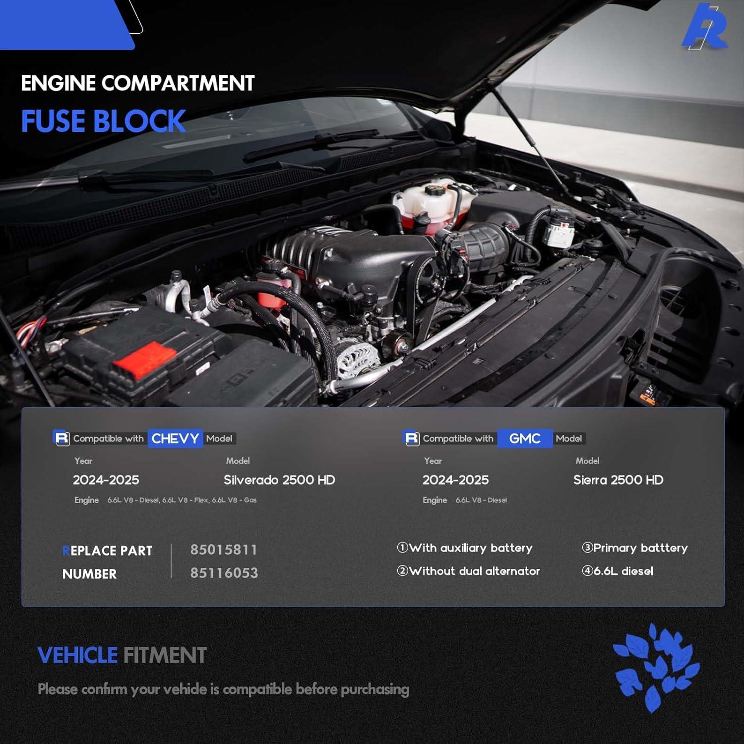● The Battery Distribution Engine Compartment Fuse Block is engineered as a direct replacement for GM part numbers # 85015811✔ and #85116053✔, offering OEM quality and compatibility for a range of Chevy and GMC models. Specifically, it fits Chevy Silverado 2500 HD✔ trucks, as well as GMC Sierra 2500 HD✔ models from 2024 to 2025, all equipped with the powerful 6.6L V8 Diesel engine. Designed to meet the demanding requirements of these heavy-duty trucks, this fuse block provides robust protection for key engine components.