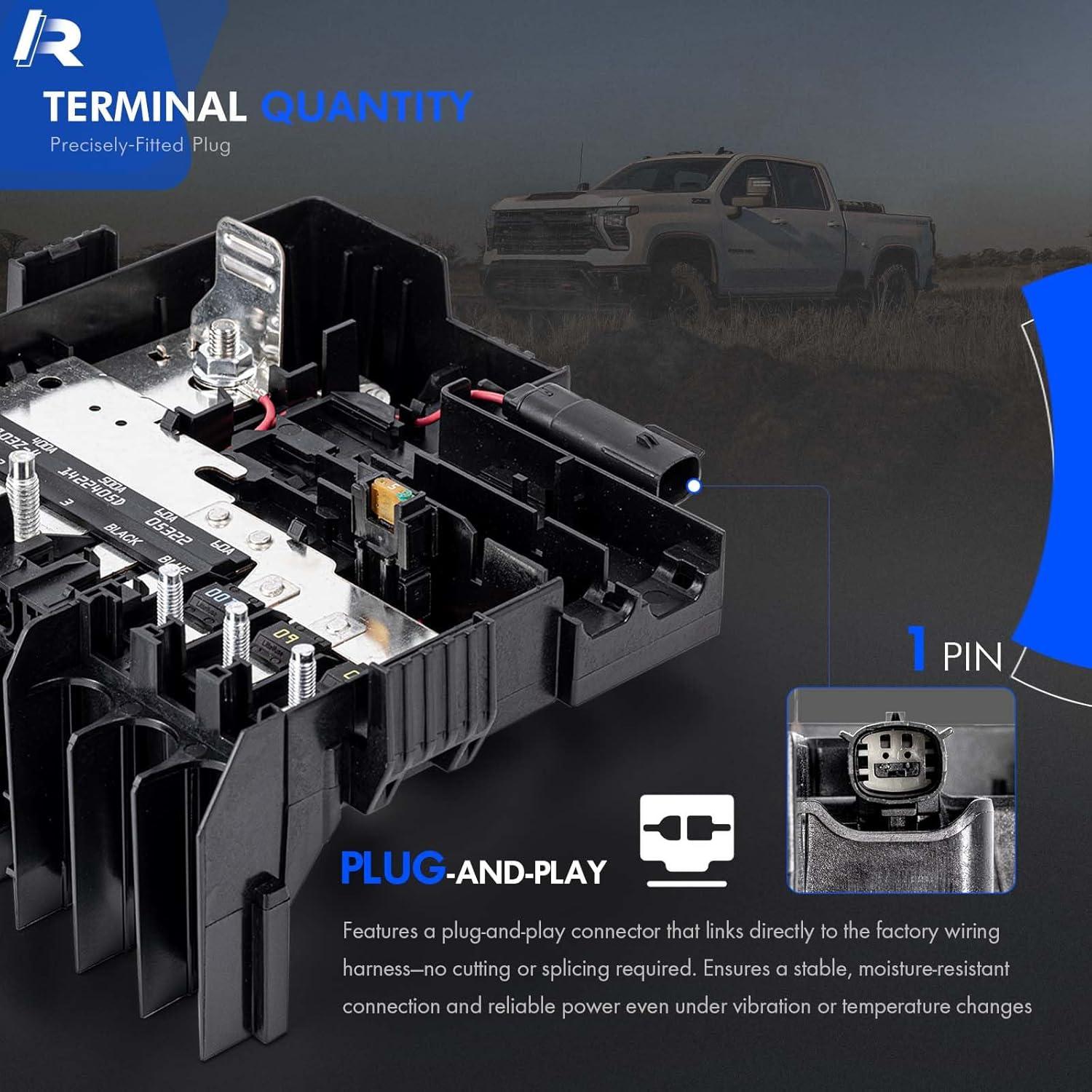 ● In summary, this Battery Distribution Engine Compartment Fuse Block provides dependable protection and enhanced durability, ensuring high performance for Chevy Silverado and GMC Sierra heavy-duty trucks. Its OEM-grade quality, combined with its durable materials and crucial protective functions, makes it an ideal choice for truck owners seeking long-term reliability and engine protection.